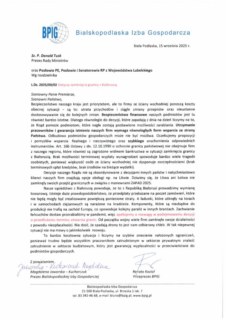 Pismo BPIG w sprawie zamknięcia granicy z Białorusią