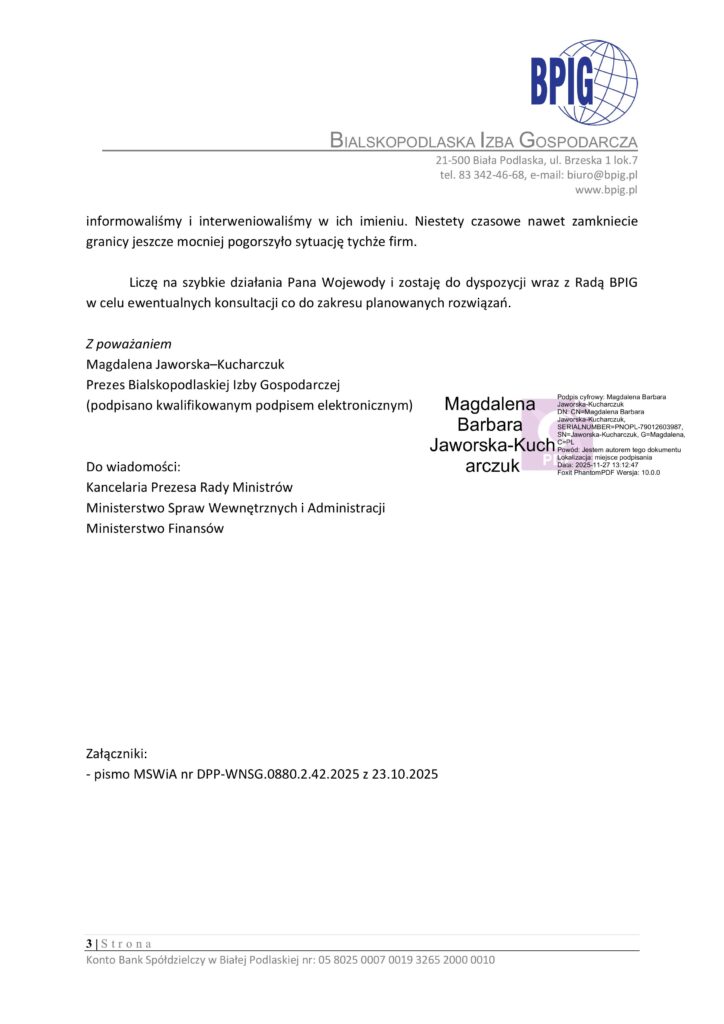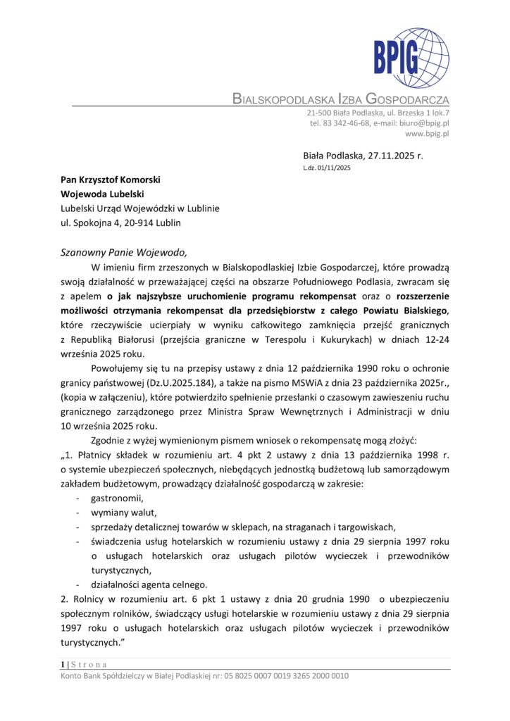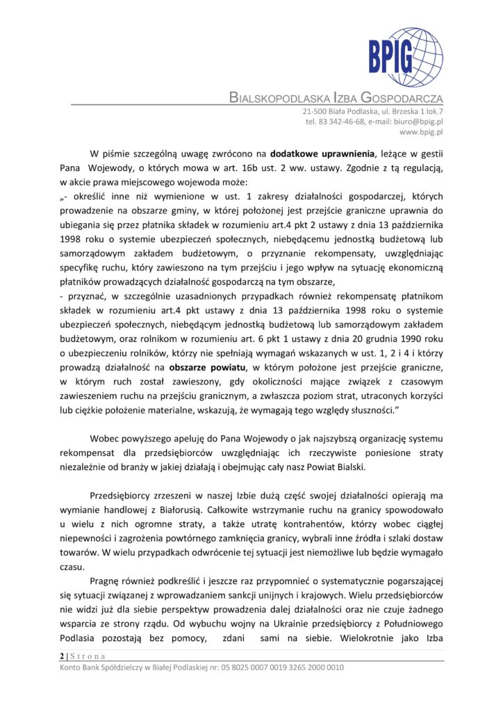 W piśmie zwróciliśmy również uwagę na konieczność rozszerzenia systemu rekompensat na wszystkie firmy, które realnie ucierpiały w wyniku zamknięcia granicy – niezależnie od branży – obejmując cały powiat bialski. Jest to możliwe dzięki uprawnieniom Wojewody do podejmowania takich decyzji, wynikającym z zapisu ustawy o ochronie granicy państwowej.